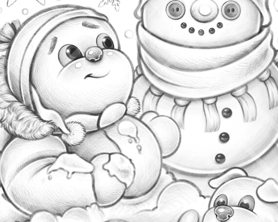 Snow Playing Grayscale Christmas Coloring Page For Kids And Etsy